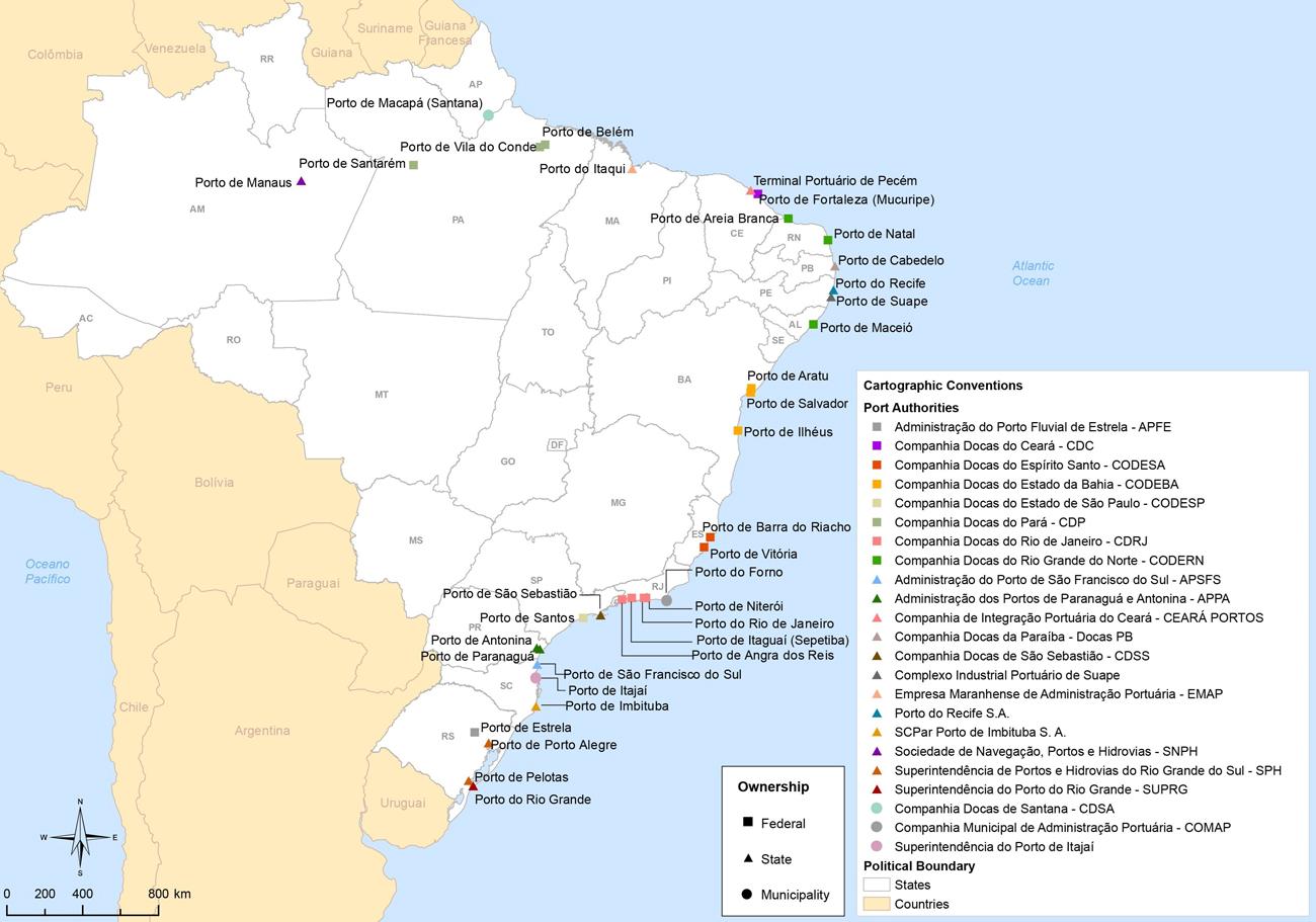 Mapa do Brasil portas. Brasil portas mapa (América do Sul - Américas) para imprimir. Brasil portas mapa (América do Sul - Américas) para download. A navegação costeira no Brasil liga partes amplamente separadas do país. Dos 36 portos de águas profundas, Santos e Rio de Janeiro são os mais importantes, seguidos por Paranaguá, Recife, Vitória, Tubarão, Maceió e Ilhéus, como mostra o mapa dos portos do Brasil. A Bolívia e o Paraguai receberam portos livres em Santos. Existem 50.000 km de vias navegáveis interiores. Em 2002, a frota da marinha mercante, que incluía 165 embarcações (1.000 TAB ou mais), tinha um total de 3.662.570 TAB.
