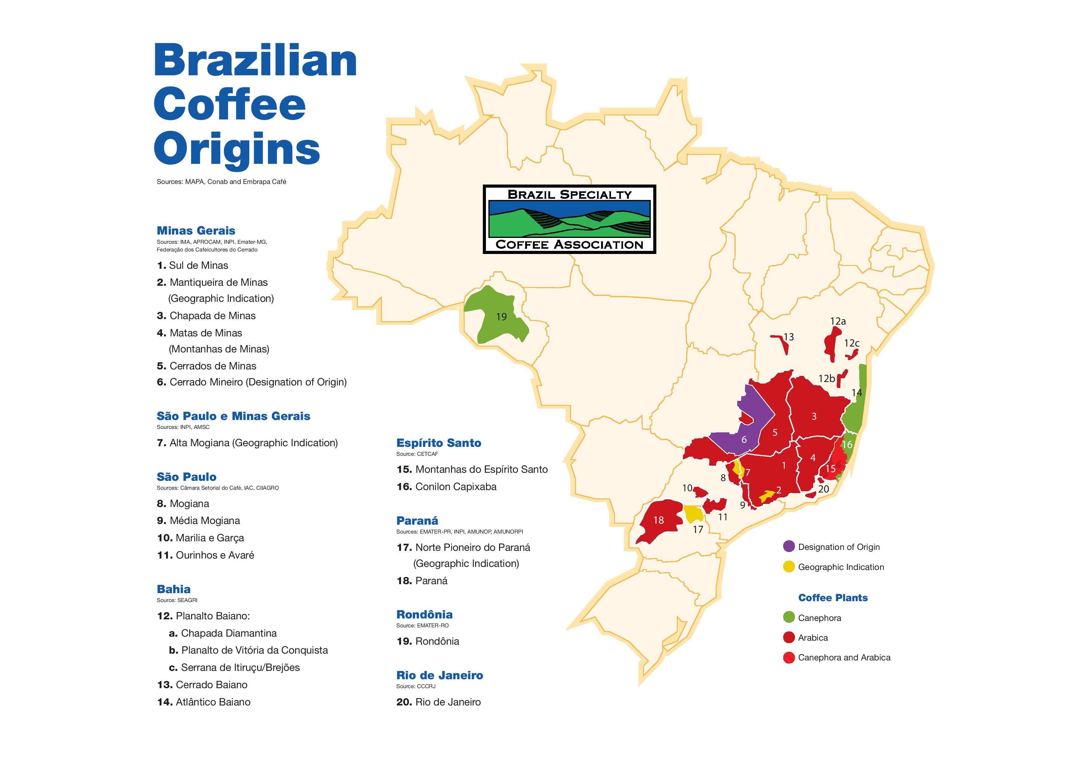 O Brasil tem cerca de 300.000 plantações de café espalhadas por treze de seus estados, conforme mencionado no mapa do café brasileiro. O café brasileiro é normalmente exportado nestas formas: Café verde, Café moído e torrado, Café solúvel, Extratos concentrados/essenciais, Resíduos de café. O café cultivado no Brasil é predominantemente da variedade Arábica, compondo cerca de 80% da safra total. A época da colheita vai de maio a agosto.