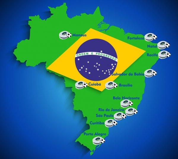 O Maracanã, oficialmente chamado de Estádio Mário Filho, como é mencionado no mapa do Brasil, foi construído para servir como o principal local para a Copa do Mundo de 1950. O objetivo era se tornar o maior estádio de futebol do mundo. No início dos anos 50, São Paulo iniciou uma busca por um local para a construção de um novo estádio. Eles finalmente conseguiram comprar um terreno na área do Morumbi, naquela época uma área habitada de florestas e pântanos ainda fora da cidade. O Estádio Nacional de Brasília Mané Garrincha foi construído para servir como o novo estádio nacional do Brasil e para ser um dos locais de jogo da Copa do Mundo da FIFA 2014. Mineirão, oficialmente chamado Estádio Governador Magalhães Pinto, foi construído para oferecer à cidade de Belo Horizonte uma alternativa maior para o Estádio Independência, então o principal local da cidade.